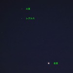 説明 | 宵の明星の金星の近くで見られた、 オレンジ色の火星と白色のしし座のレグルスの接近した様子です。 |