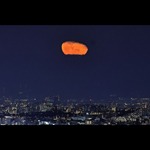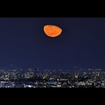 説明 | 大阪の夜景の彼方から昇ってきた、 オレンジ色に染まった月齢19.5の月です。 |