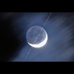 説明 | 地球照が見える三日月の手前を、 土星に向かって国際宇宙ステーション(ISS)が通過していきました。 |