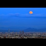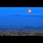 説明 | 左下にあべのハルカスを見下ろしながら、 ブルーモーメントで蒼く染まった空に棚引く雲から顔を出した、 満月1日前のオレンジ色の月です。 |