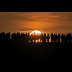 説明 | 大阪・関西万博の大屋根リングに登っている多くの人が、 夕陽をバックにシルエットになって写っています。 |
