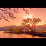 余呉一本桜にかかる夕日